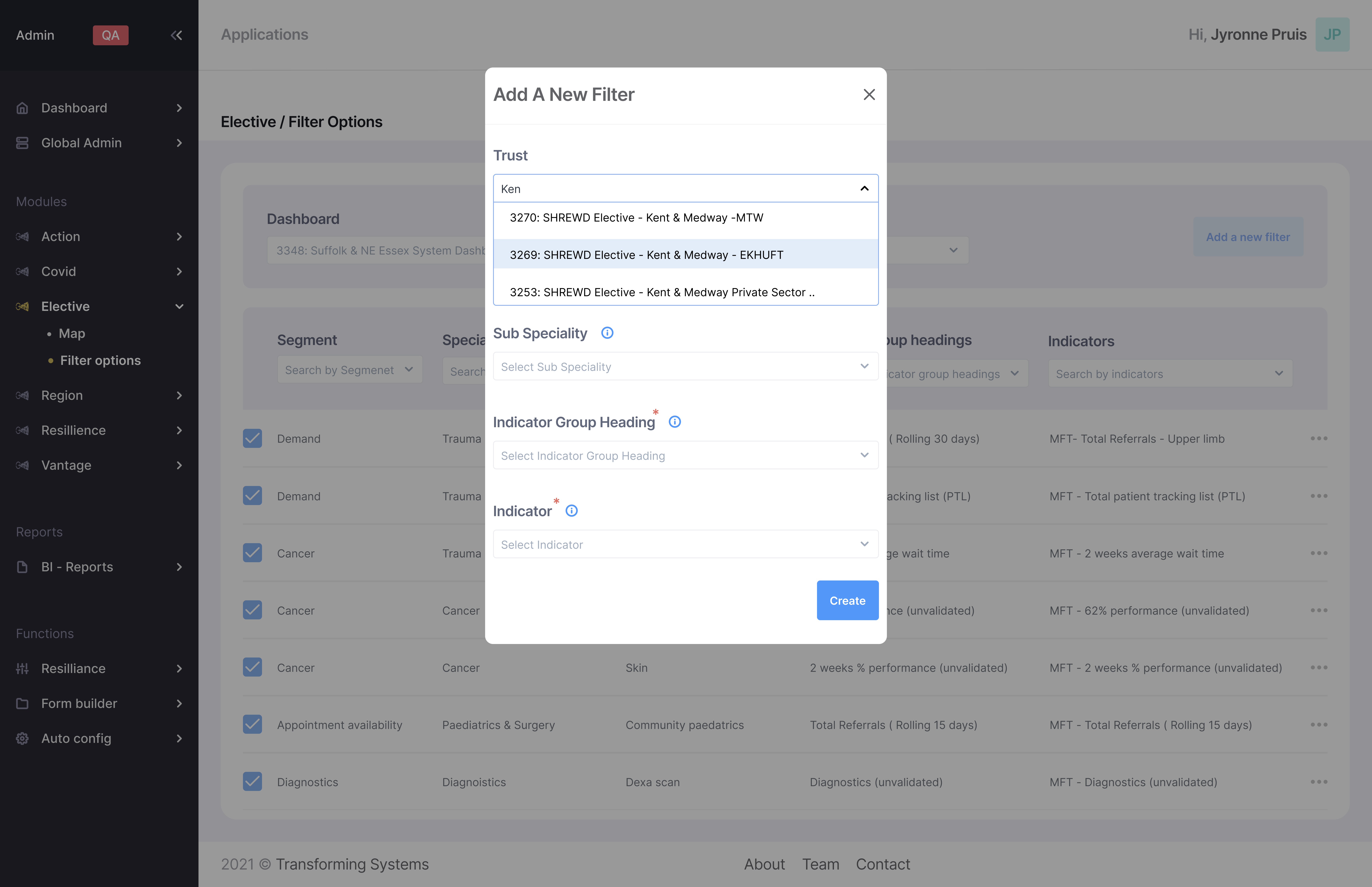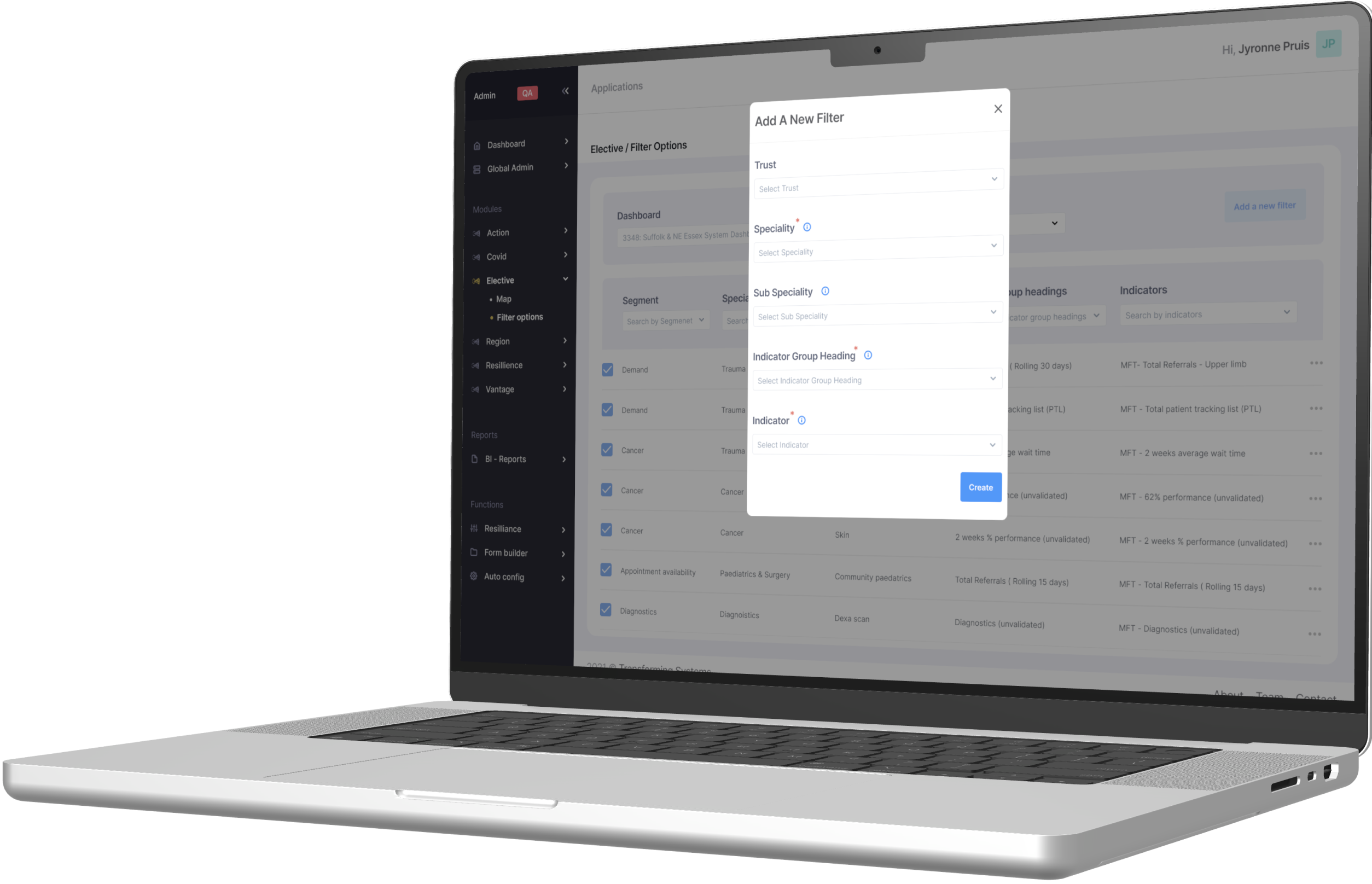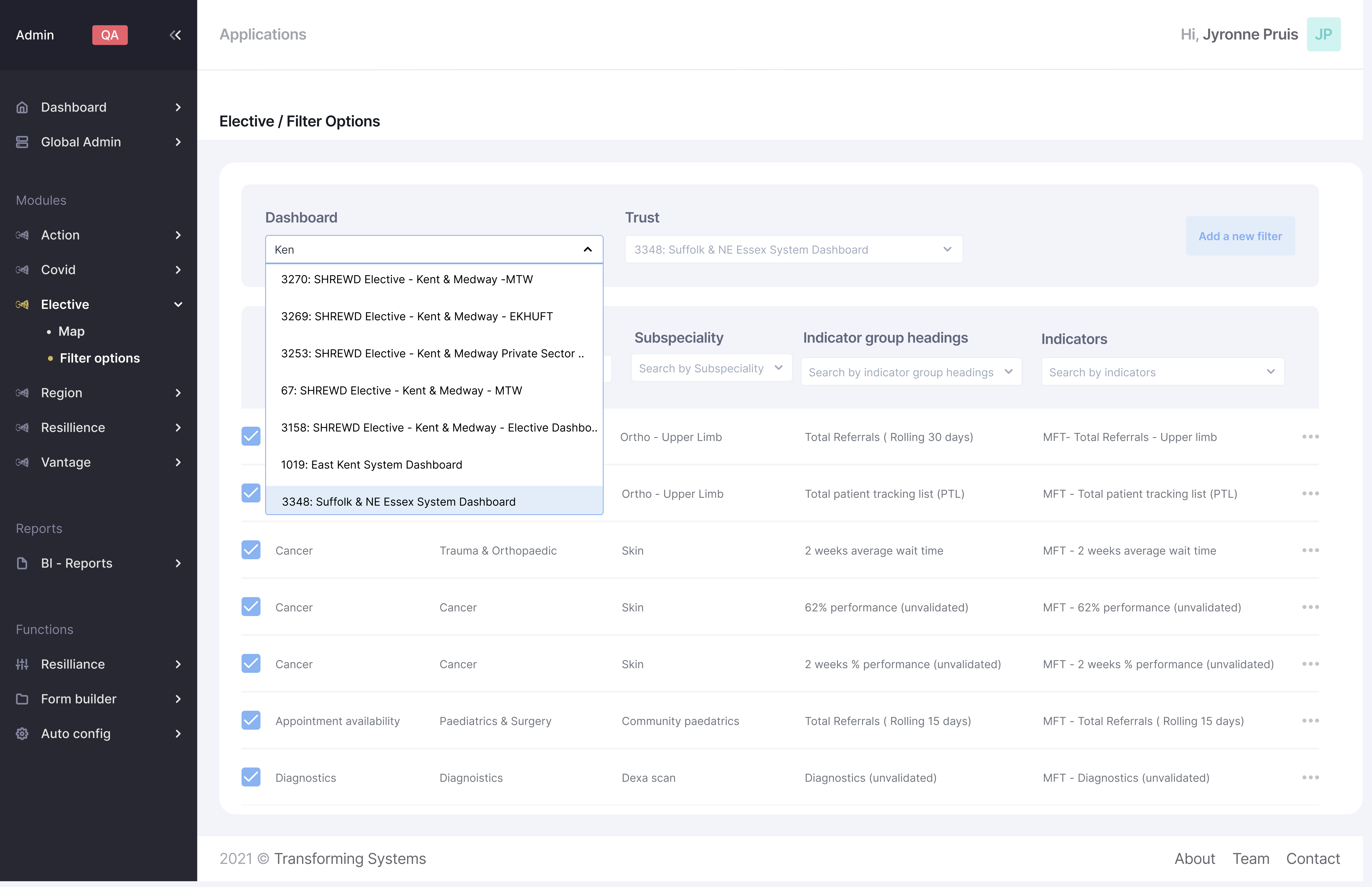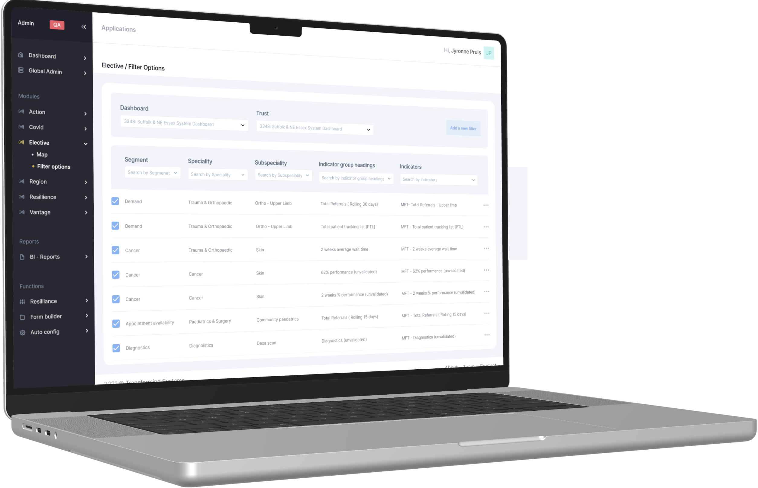 A spreadsheet like dashboard where the user is able to choose the clients through the hospital name and trusts to configure or add new filters and indicators in a matter of minutes.