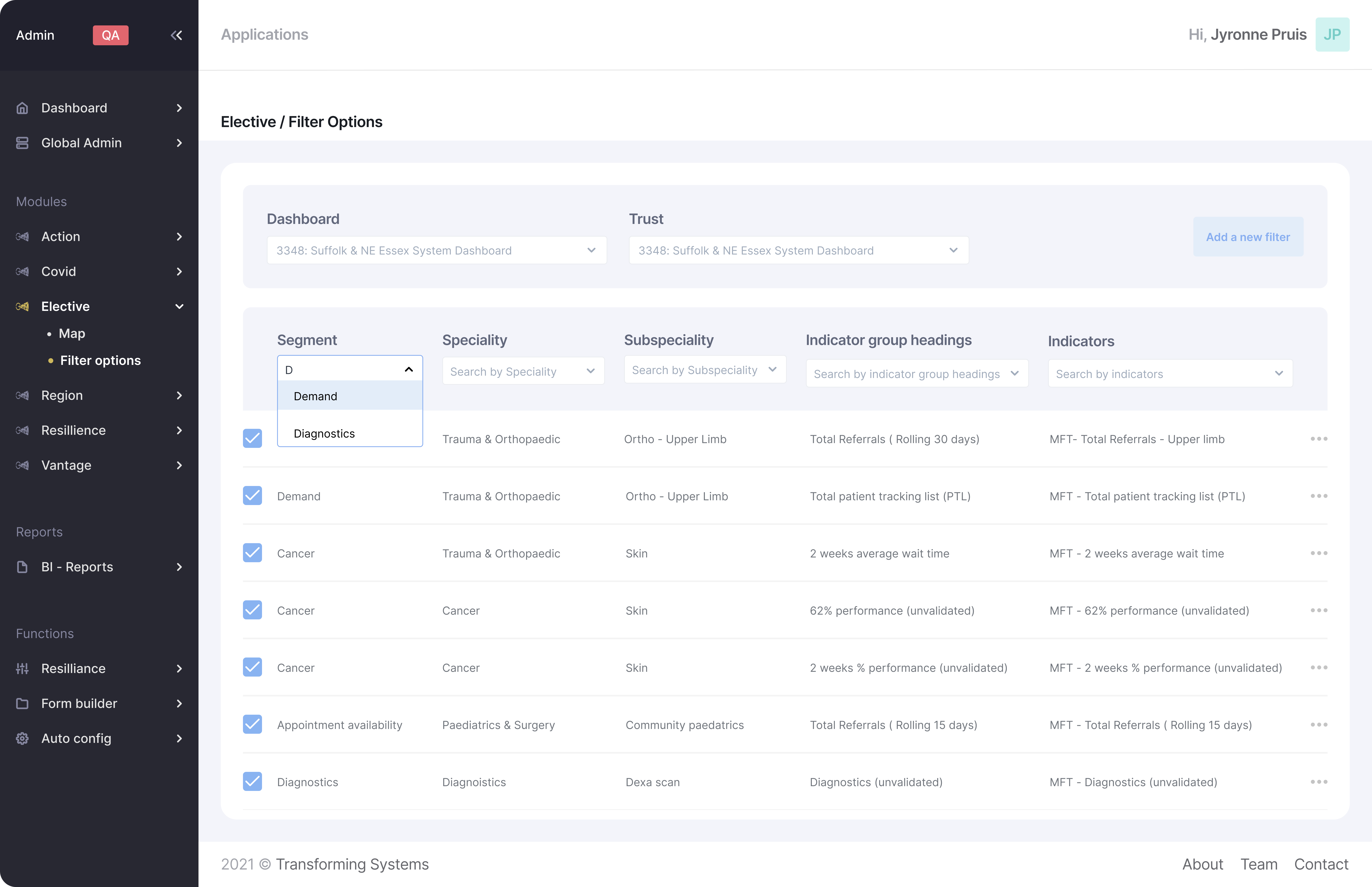 Dashboard: Every client of Transforming Systems receives a unique dashboard where they have their own indicators and filters. By speaking to Transforming Systems the client is able to change and configure what filter options they show.