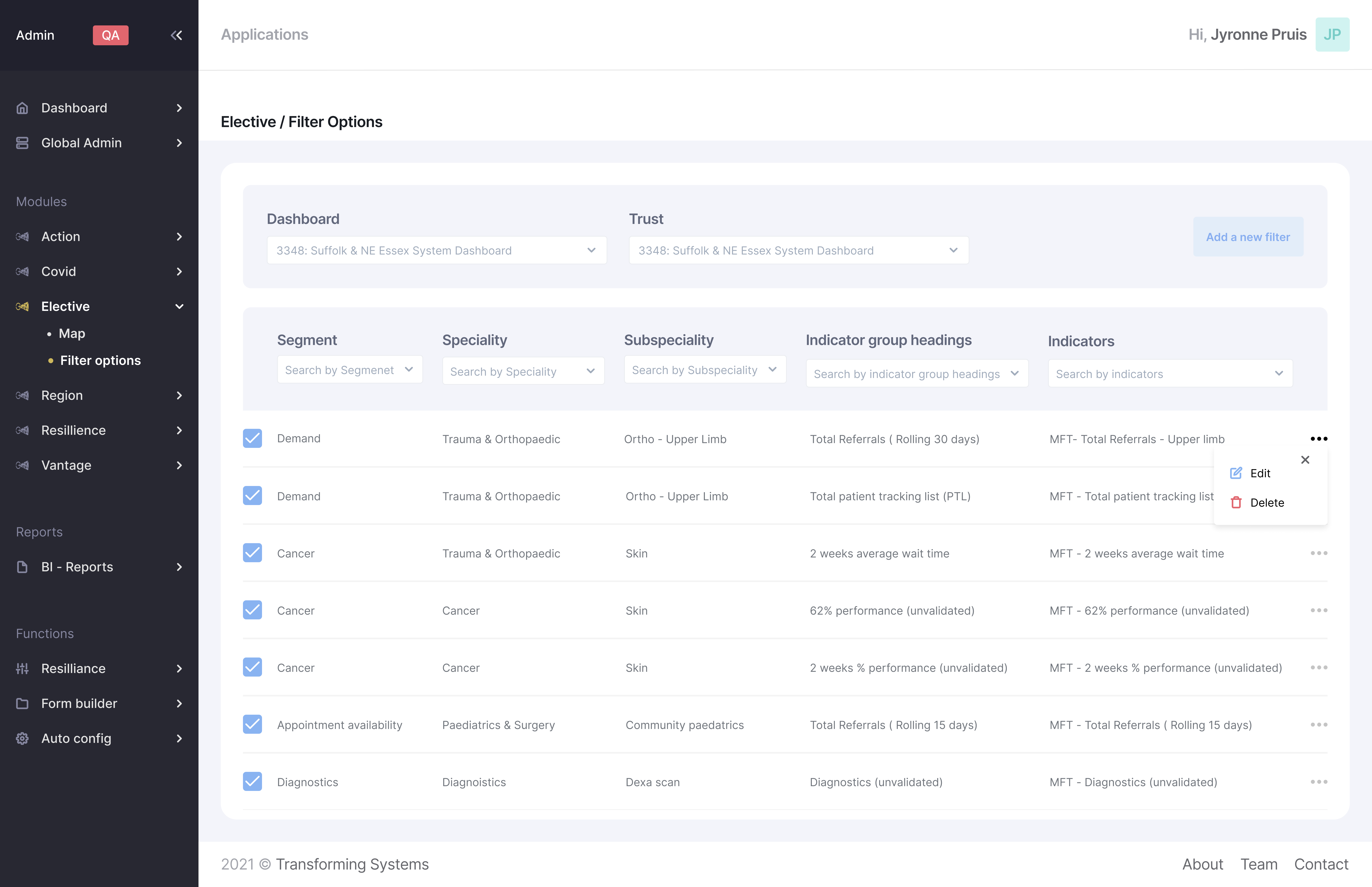Edit and delete: By clicking on the 3 dot icon the user will be presented with a menu where they can edit or delete the filter option.