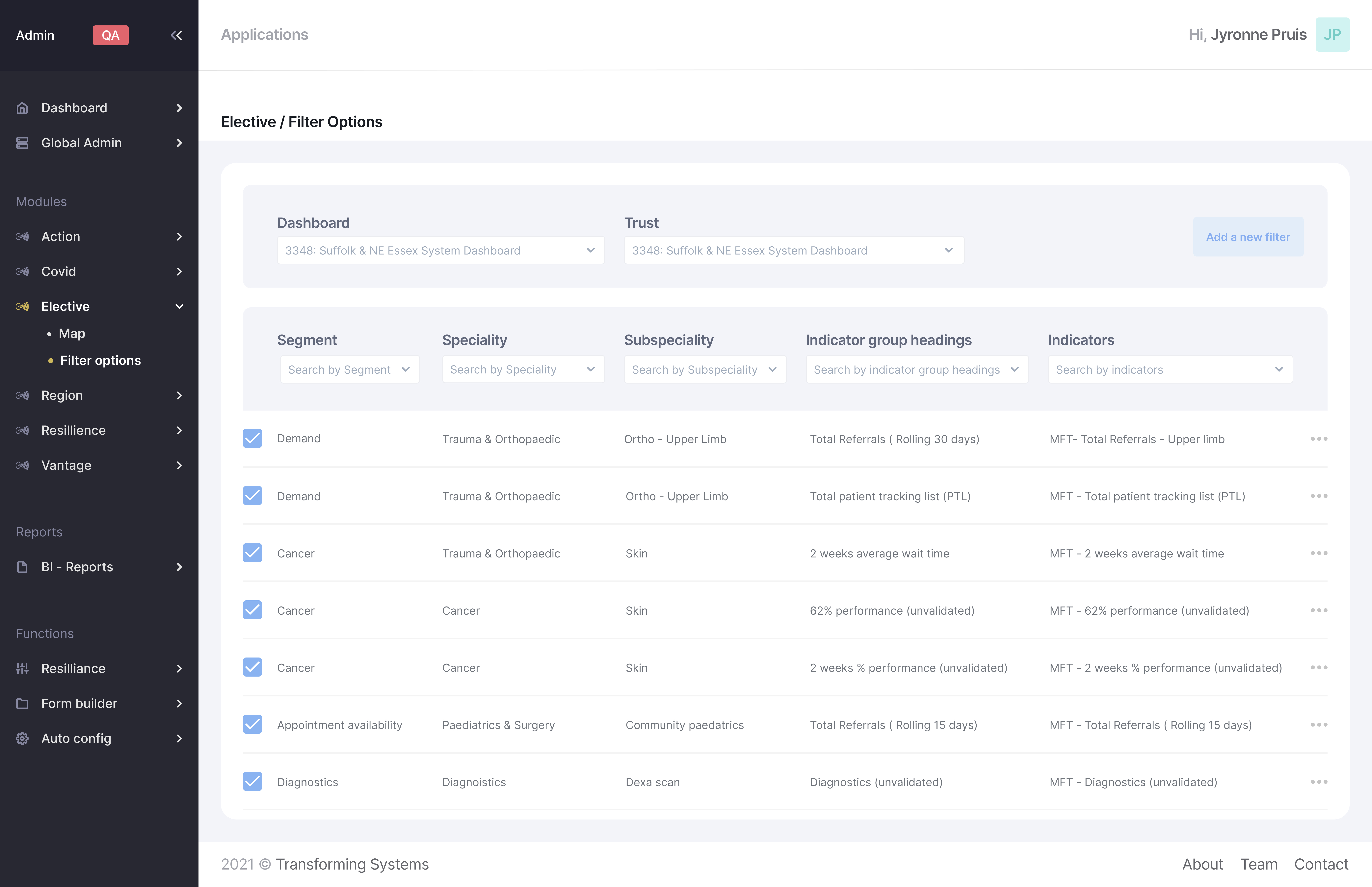Dashboard: Every client of Transforming Systems receives a unique dashboard where they have their own indicators and filters. By speaking to Transforming Systems the client is able to change and configure what filter options they show.